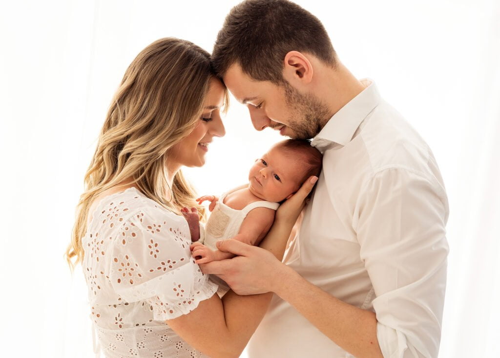 Zdjęcia wykonuję na białej scence z łóżkiem i oknem. Rodzicom i rodzeństwu proponuję więc włożyć coś jasnego/białego. Jeśli chodzi o tatę to sprawdzi się tutaj biała koszulka lub koszula bez napisów i nadruków oraz jasne np. beżowe spodnie. Dla mamy dobrym wyborem będzie biała sukienka. Mama może też skorzystać z białych długich sukienek, które posiadam w swojej garderobie. Na życzenie możemy również wykonać ujęcia na czarnym tle. Proszę wówczas o zabranie czarnych gładkich koszulek z krótkim rękawem bez napisów i nadruków